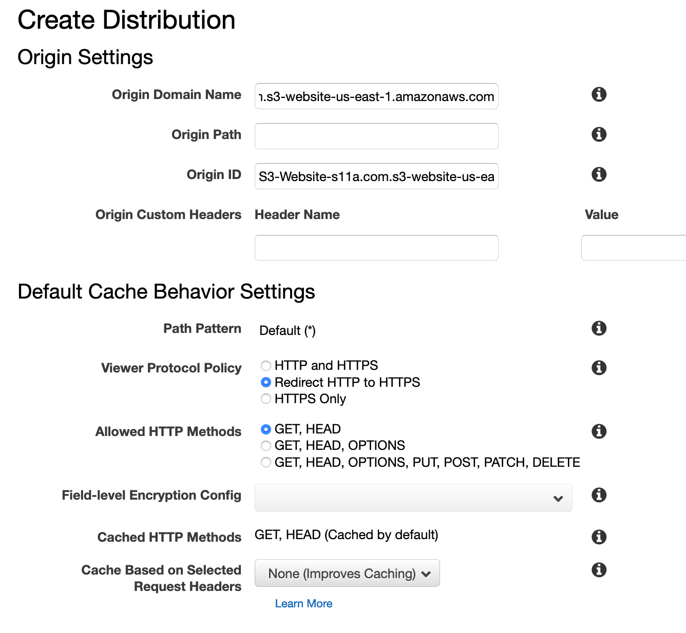 Origin Domain Name: Set this to the S3 website endpoint for one of the buckets. You may see autocomplete options, which may work for your case. In my experience letting this part autocomplete may have adverse effects. It's best to copy the bucket endpoint directly (i.e. the URLs from step 1 with the format