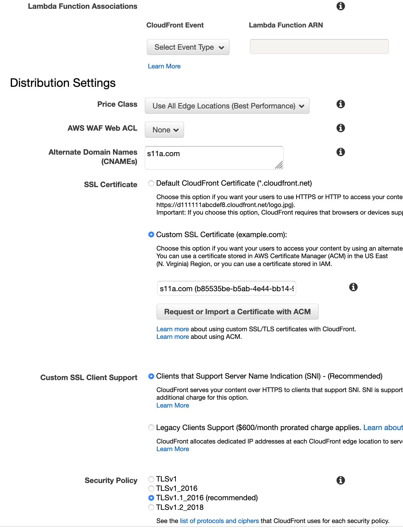 Alternate Domain Names: This should match the name of the S3 bucket you’re pointing to (i.e. example.com)
