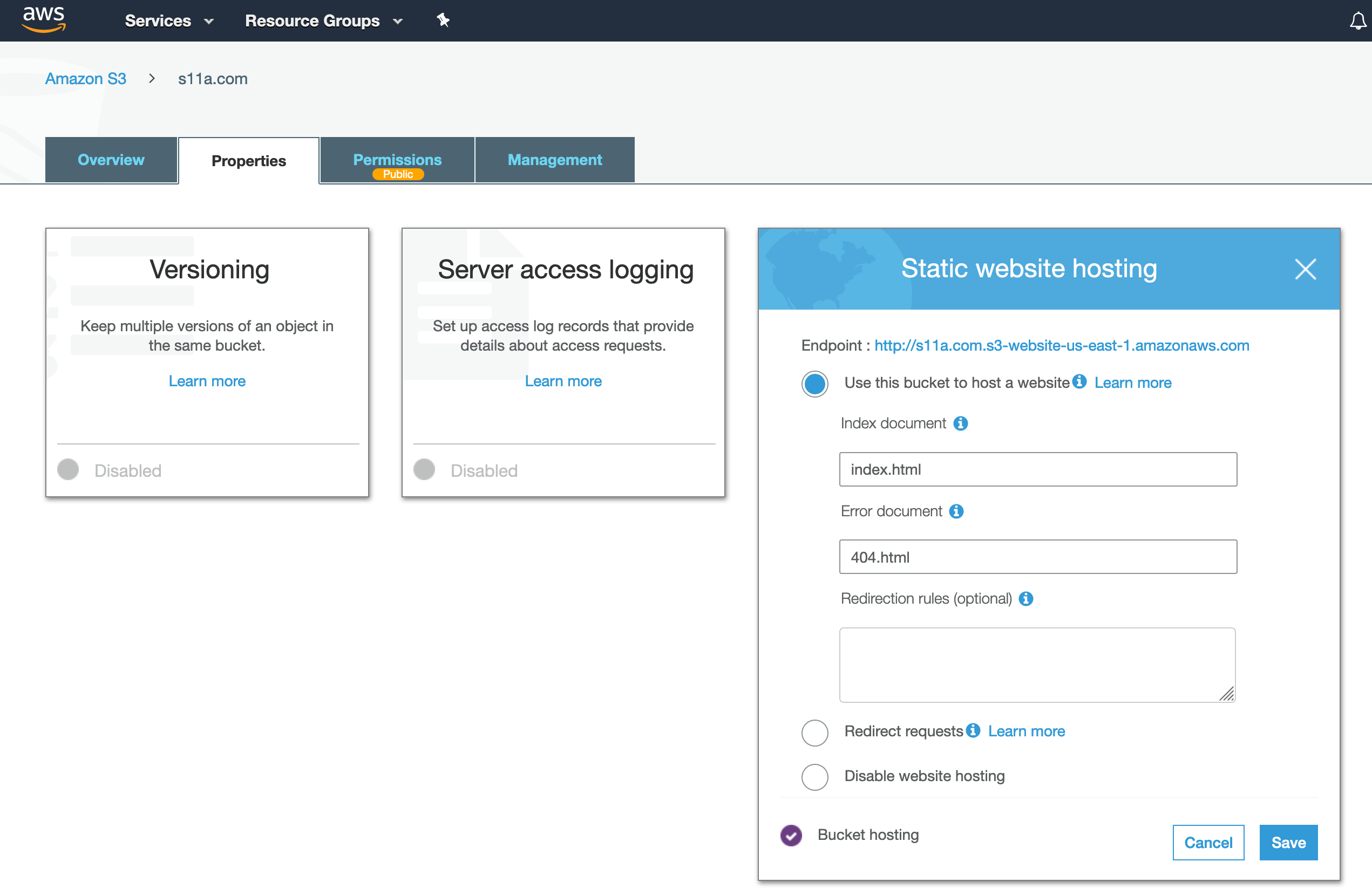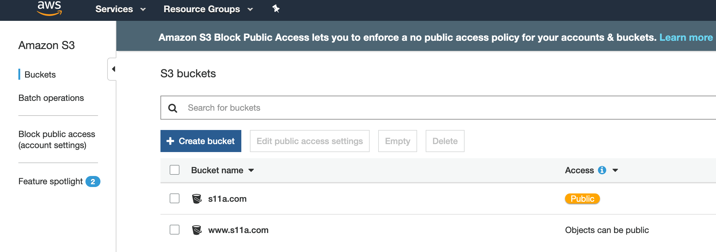 To host the site with this method, it is important to set up two buckets. One bucket should be the name of your website, and another prefixed with www (in my case s11a.com and www.s11a.com):